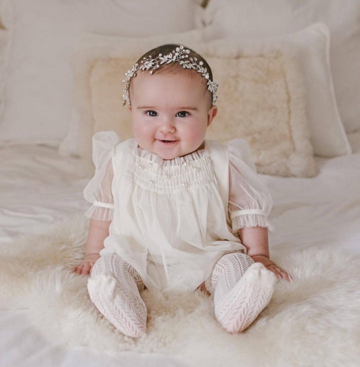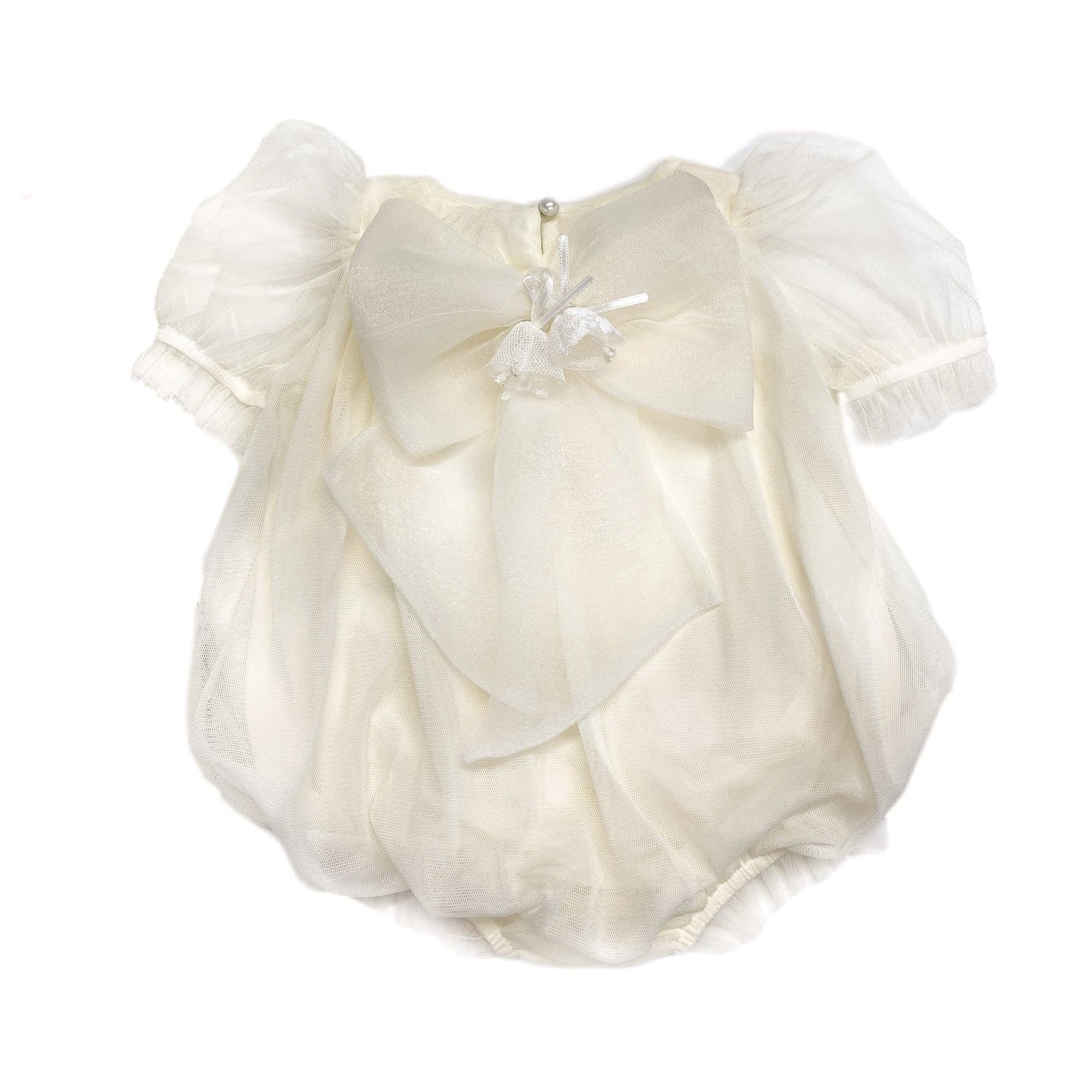 Darling buttermilk ivory color tulle romper with smock front adorned with faux pearl and large organza bow and bell detail in the back. Sheer tulle sleeves.